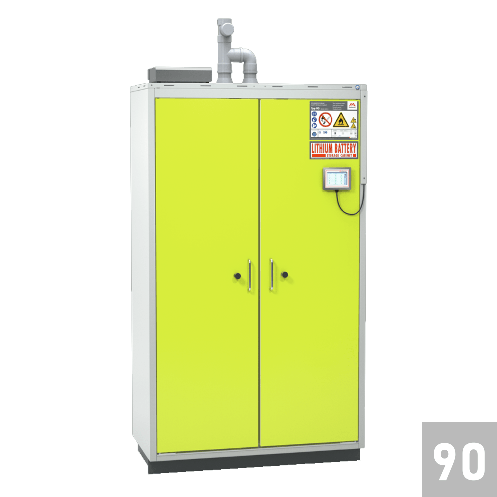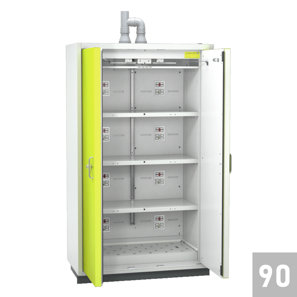 Battery Standard XL V4 Cabinet provides secure and efficient storage. To ensure durability, its sheet steel outer carcass has a RAL 7035 finish. Meanwhile, the doors feature a bold PANTONE 389 C finish. Inside, the decor panels in RAL 7035 contribute to a cohesive and sturdy design.