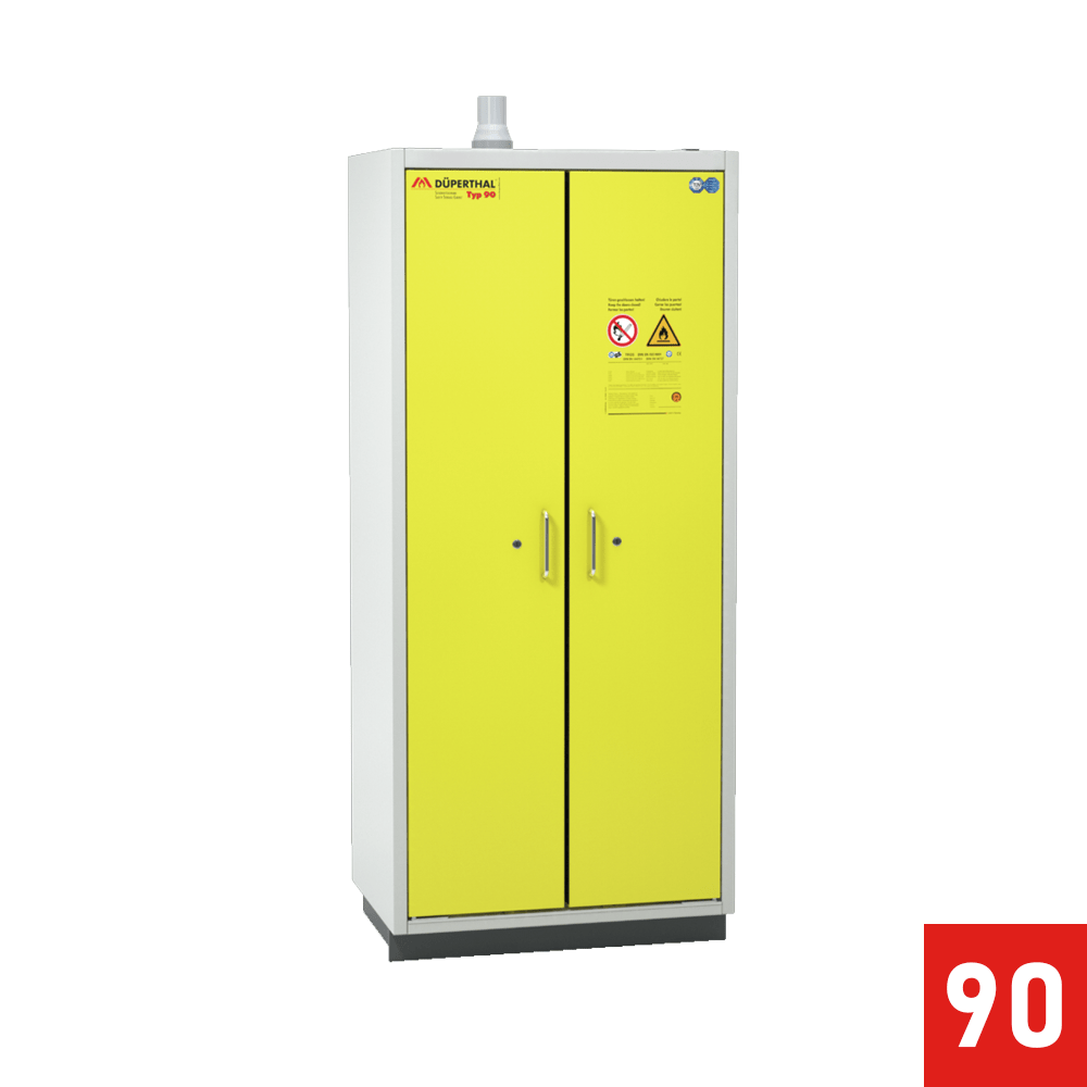 The CLASSIC PRO L – V3 cabinet ensures safe and efficient storage of flammable liquids in laboratories and industrial facilities. Its outer carcass, made of sheet steel in RAL 7035, offers durability and resistance to wear. The sheet steel door, coated in RAL 1018, closes automatically during a fire while remaining open for easy access.