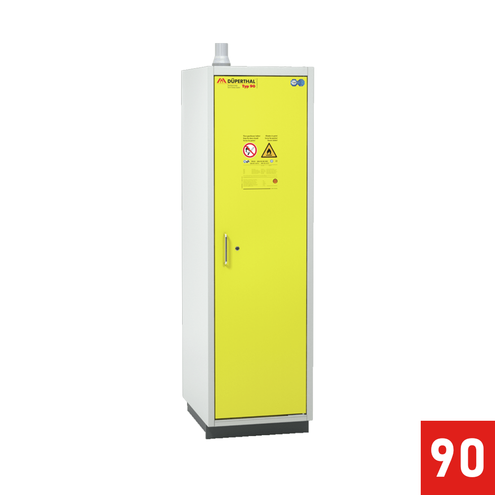 For added safety, the interior fittings conductively connect to the carcass, reinforcing security. Moreover, the adjustable foot ensures level placement, contributing to stability. Likewise, the recessed base, finished in RAL 7015, further enhances balance. As a result, with three storage levels and compliance with type 90 standards, this cabinet provides reliable storage for flammable liquids.
