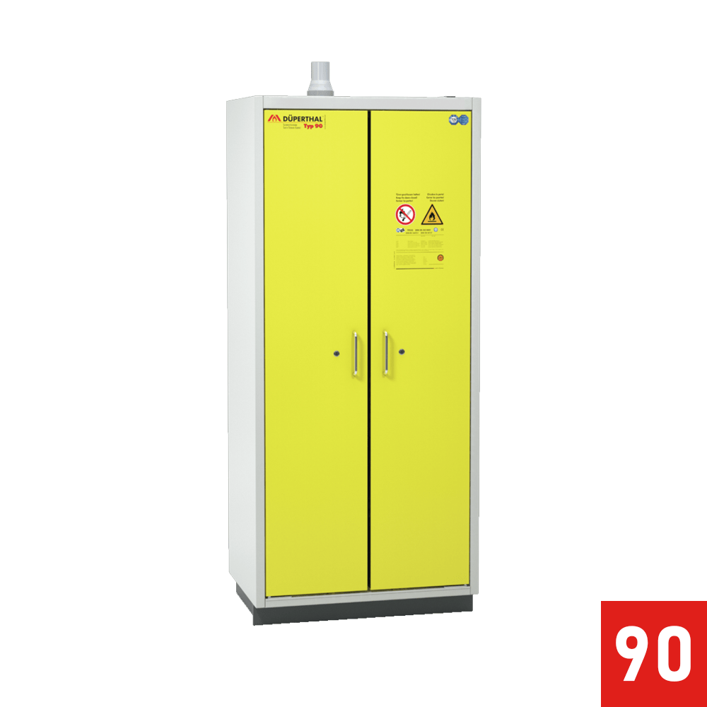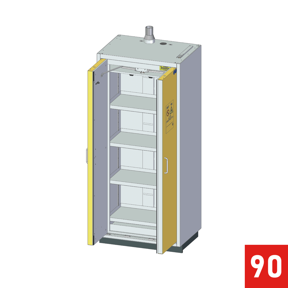 The CLASSIC Standard L cabinet ensures safety and functionality in laboratory environments. Its outer carcass and bottom tray, made of durable sheet steel in RAL 7035, provide long-lasting reliability. The door, finished in RAL 1018, closes automatically during a fire but remains open for easy access.