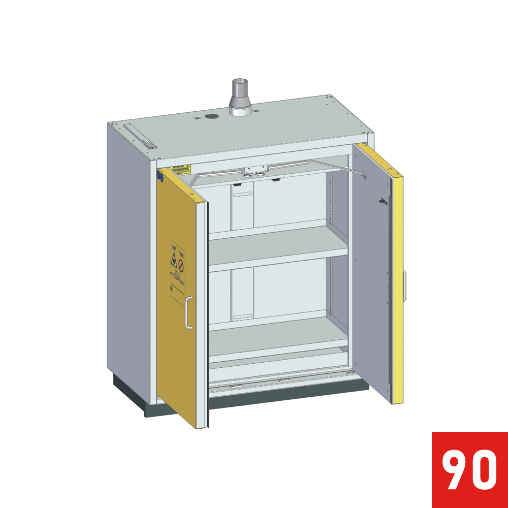 Inside, the inner carcass features decor panels in RAL 7035, creating a clean and professional appearance. Moreover, the bottom tray, made of sheet steel, adds durability. To support proper ventilation, the exhaust air connection socket is located on the roof, while the ventilation opening allows for visual airflow monitoring.